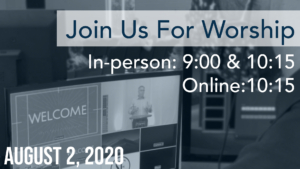 We will have two services in the Family Center and one online.  Worship at the building will be at 9 AM for those 60+, and at 10:15 AM for all others.  The online service will begin at 10:15 AM, to match up with the second service at the building.  Click here for all the details.  Click here to see what you can expect this Sunday.  Please bring your mask.