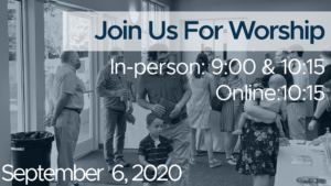 We will have two services in the Family Center and one online. Worship at the building will be at 9 AM for those 60+, and at 10:15 AM for all others. The online service will begin at 10:15 AM, to match up with the second service at the building. Click here for all the details. Click here to see what you can expect this Sunday. Please bring your mask.